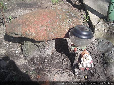 Lauri家門口的石頭磨菇與小矮人夜燈裝飾。