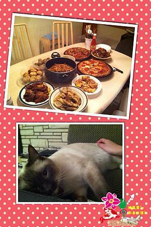 雖然說,因為我做手桿麵還有切肉絲、蔬菜等,幫大家加熱帶來的各種食物,因此開動的時間晚了一個半小時,不過,很少看到這麼多不同的食物聚集,簡直跟過年要有得拼了,哈哈! 有Pizza、煎餃、我自己親手做的手桿香菇肉絲炒麵、豆鼓雞丁、糖醋排骨、蔥油餅加起司加蛋、麻婆豆腐、肉丸子、餅乾、沙士汽水等等,好料一堆啊!!!